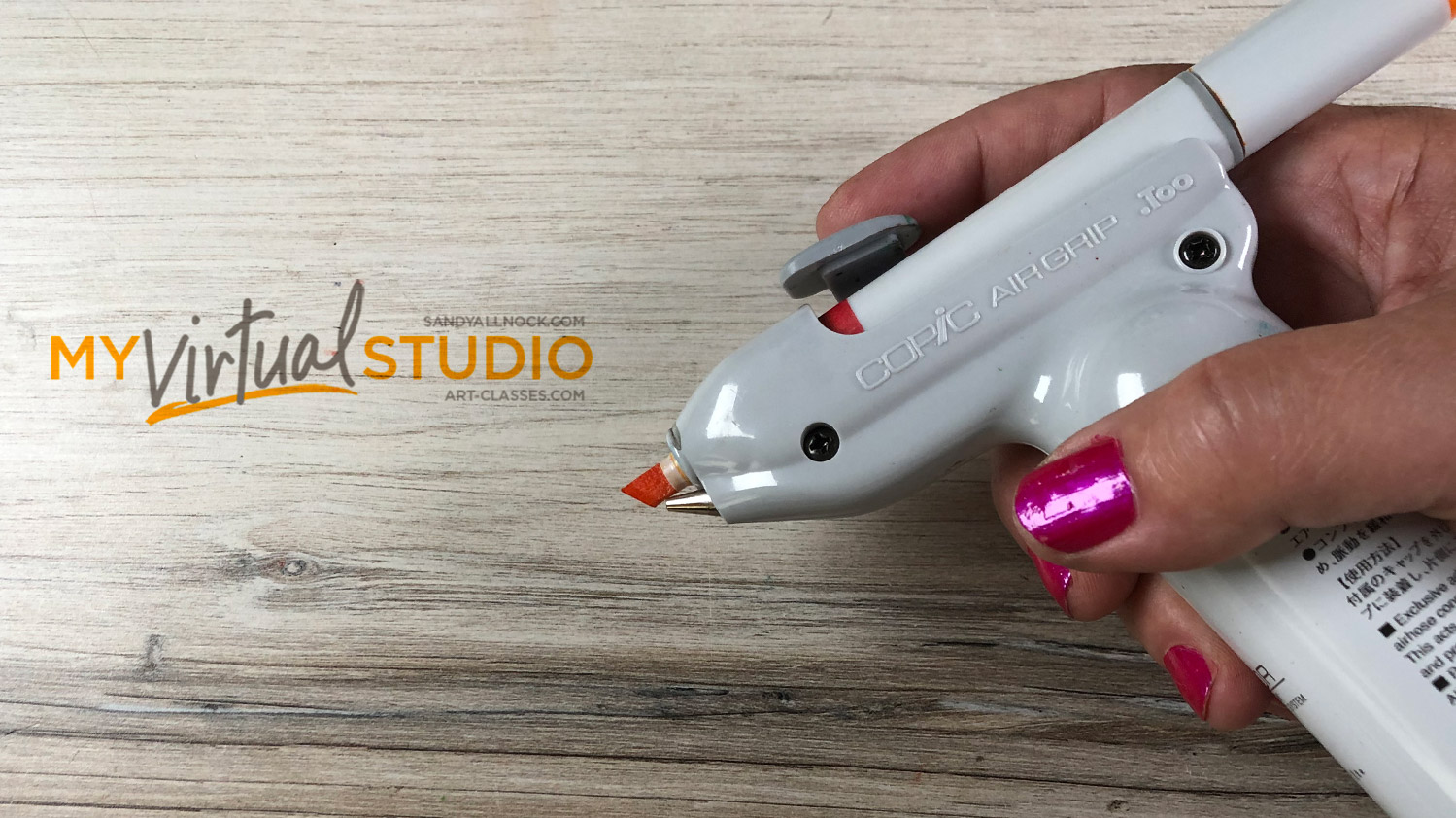 First item needed is the Air Grip (which I refer to as the “gun”) . It’s the part held in your hand, into which you insert the chisel end of a Copic marker. (Must be a Sketch or Original; Ciaos can be used carefully with a shim, but it’s a heck of a lot easier to just use a Sketch.) The air gun is sold separately from other parts, but I recommend just getting the “set” called the ABS3, as it comes with the Air Adaptor (the part that’s perpendicular to the gun) that the cord plugs into.